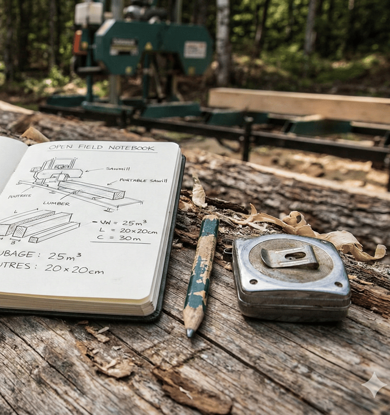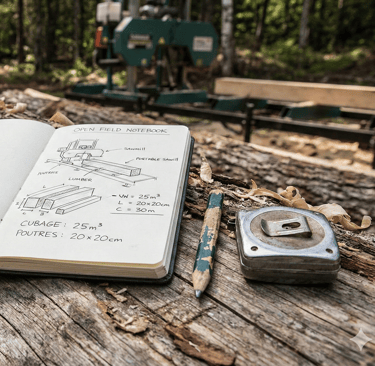 Je me déplace sur place pour réaliser un cubage contradictoire de vos grumes. C’est l’étape clé pour valider la faisabilité technique et préparer l’installation de la scierie mobile.